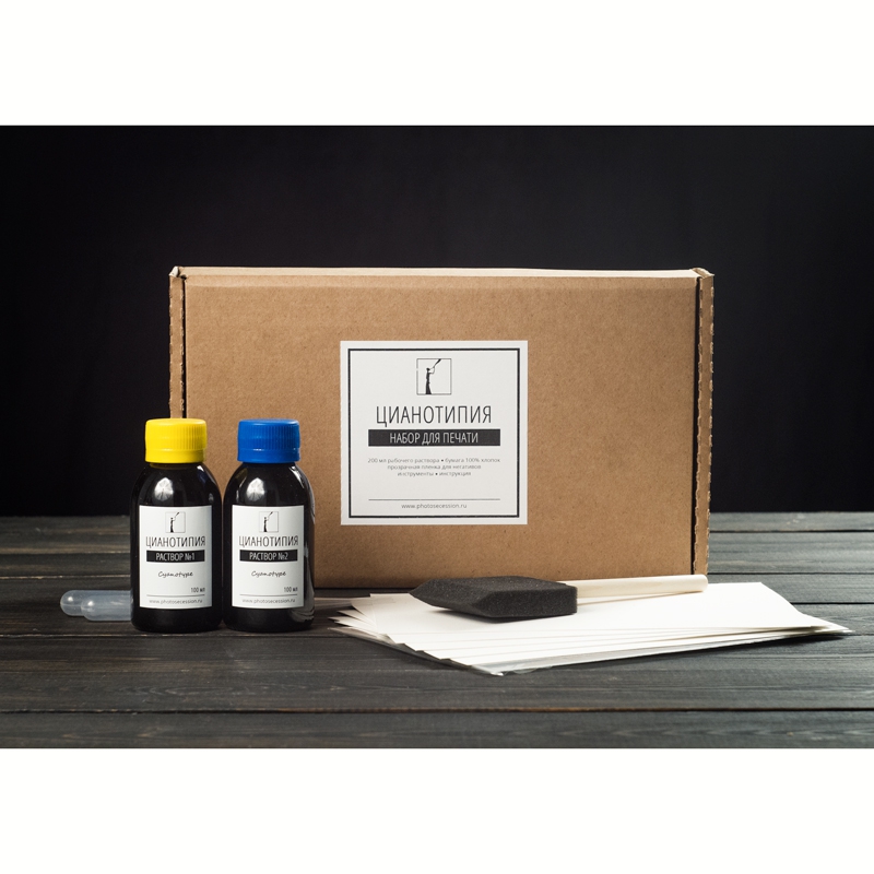Все необходимое для цианотипии в домашних условиях в одной коробке - светочувствительные растворы, хлопковая бумага, пленка для печати негативов и инструменты.